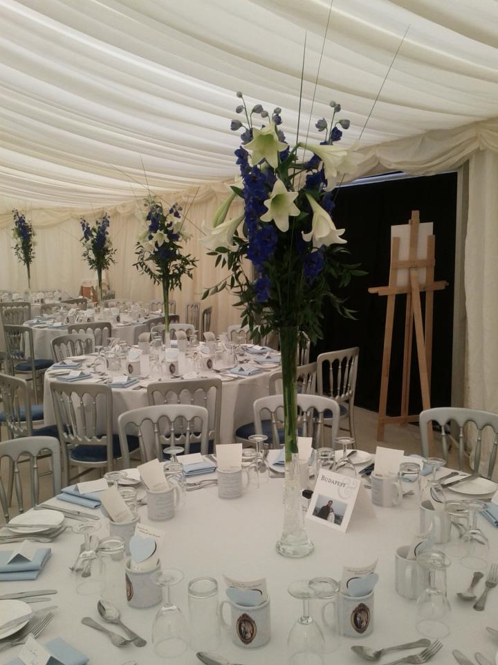 - Large rooms with high ceilings, or marquees may look better with tall table centres to make the most of the space, and to sit above eye level so your guests can see each other.