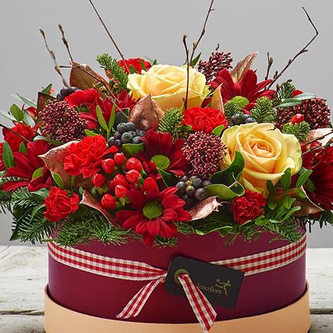 A gorgeous festive selection of our finest seasonal flowers set in a floral foam filled hat box, making this a completely hassell free gift!
