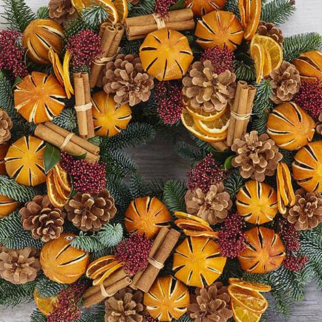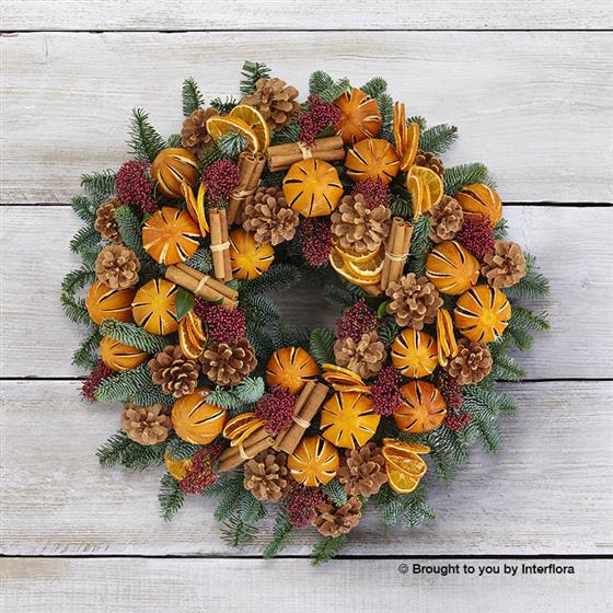 Fresh spruce & moss wreath, tastefully decorated with cinnamon bundles, dried orange slices, dried clementines and natural cones.