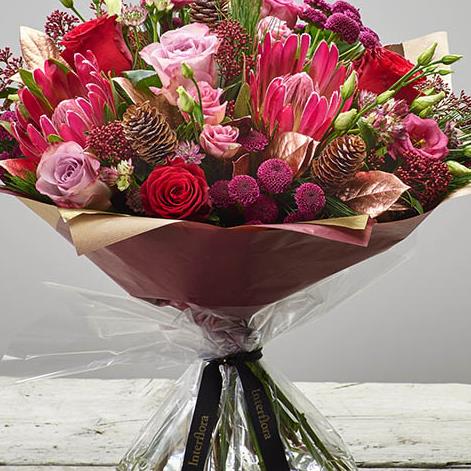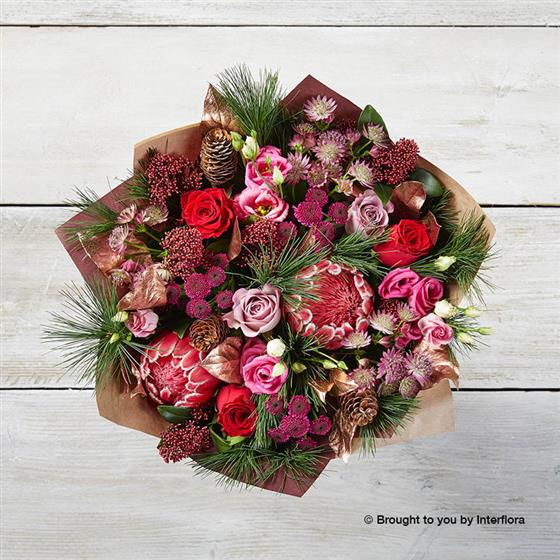 Reds, plumbs and pinks combined with pine and spruce cones make this a stunning festive arrangement.