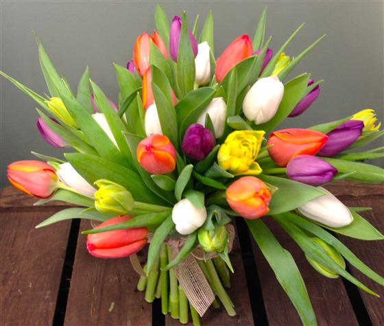 A spring bouquet of our most beautiful tulips; in a variety of colours selected by our florists.