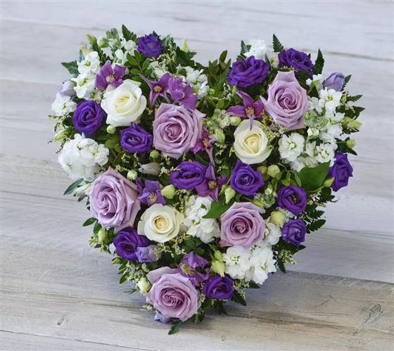 A heart tribute in beautiful purple and white shades, featuring fragrant blooms.