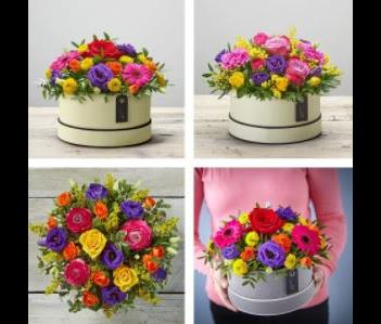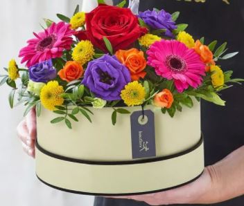 Please note that this is a florist choice arrangement, and the flowers and hat box colour used may vary from that pictured.