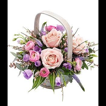 A pretty basket arrangement containing pink roses with other soft lavenders and pink flowers.