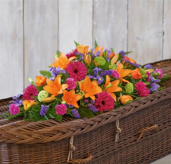 A casket spray of beautifully bright blooms including cerise, orange, greens, purple and striking pinks.